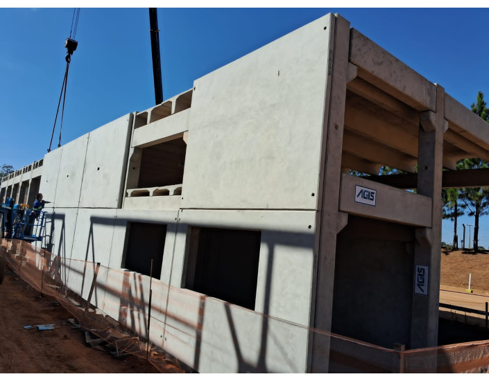 Obra com pilares, vigas, lajes e paredes em concreto.
