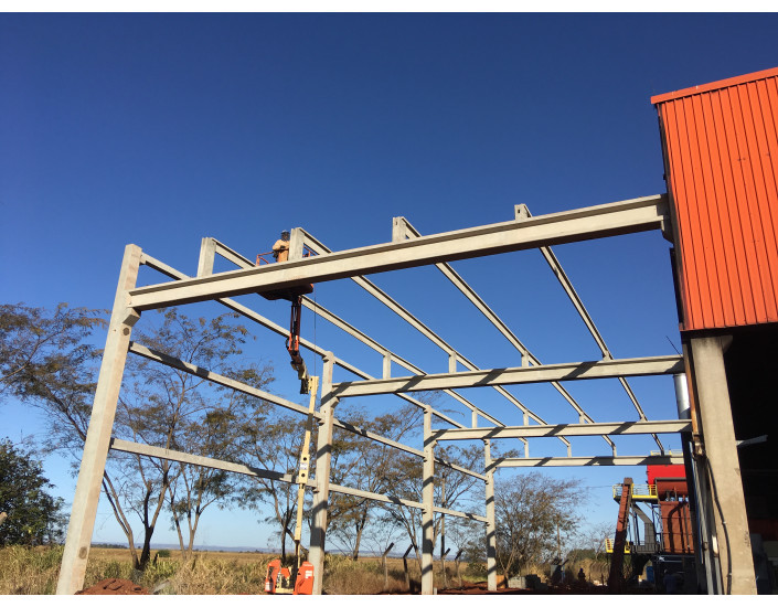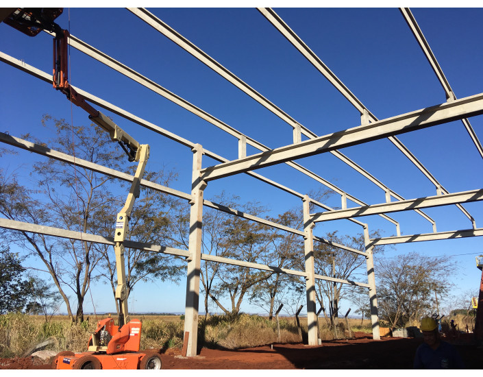 Obra com vigas de até 33 m de vão livre, pilares, terças e vigas para receber fechamento lateral em painéis isolantes.